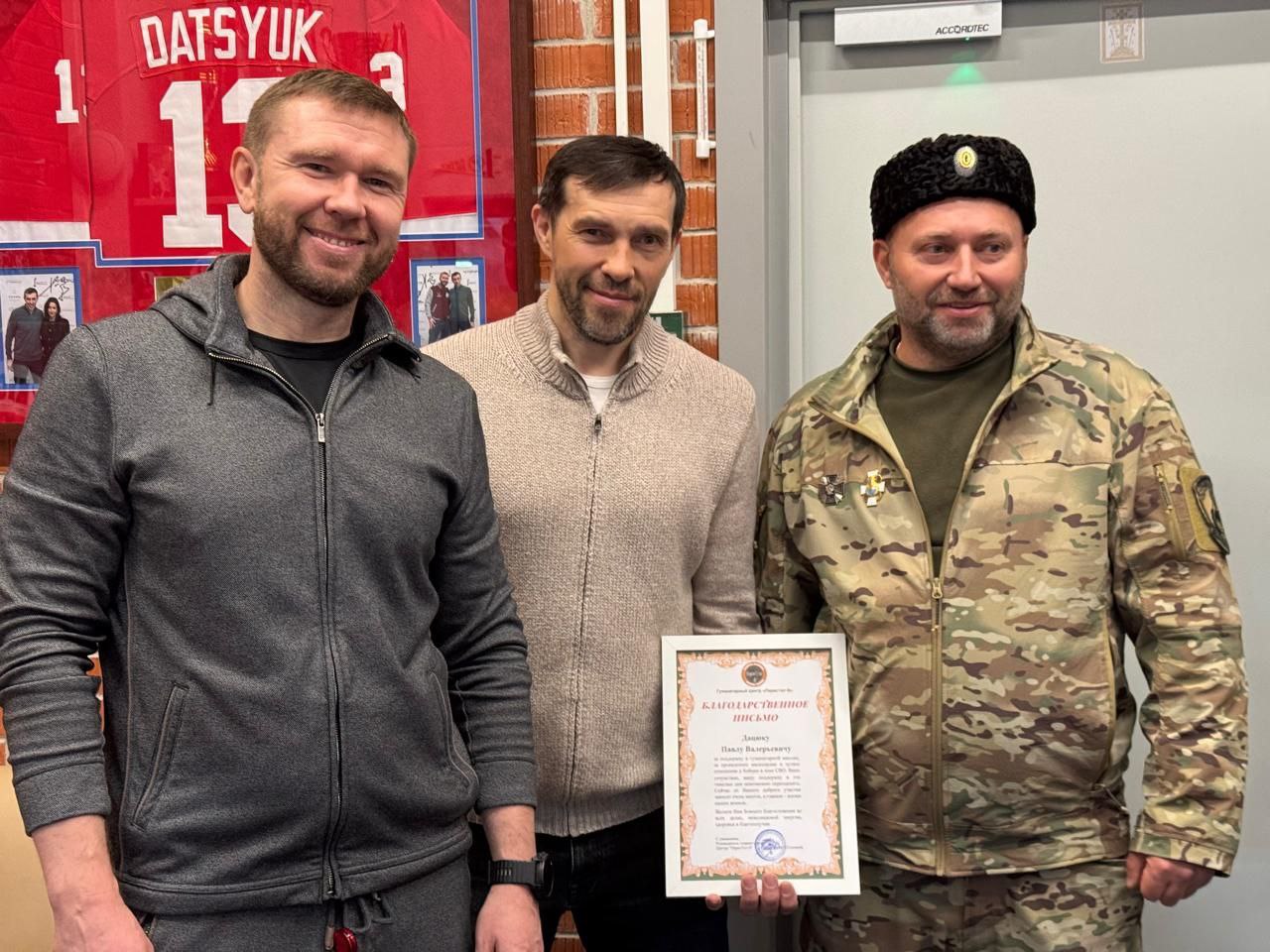 Атаман поблагодарил Павла Валерьевича за участие в проведении благотворительного хоккейного турнира "Кубок Победы", организованного волонтерским центром "ПересVет-9" при Вознесенском храме на арене хоккейного ледового дворца "Сталкер" в поддержку бойцов в зоне СВО, а также вручил благодарственное письмо.
