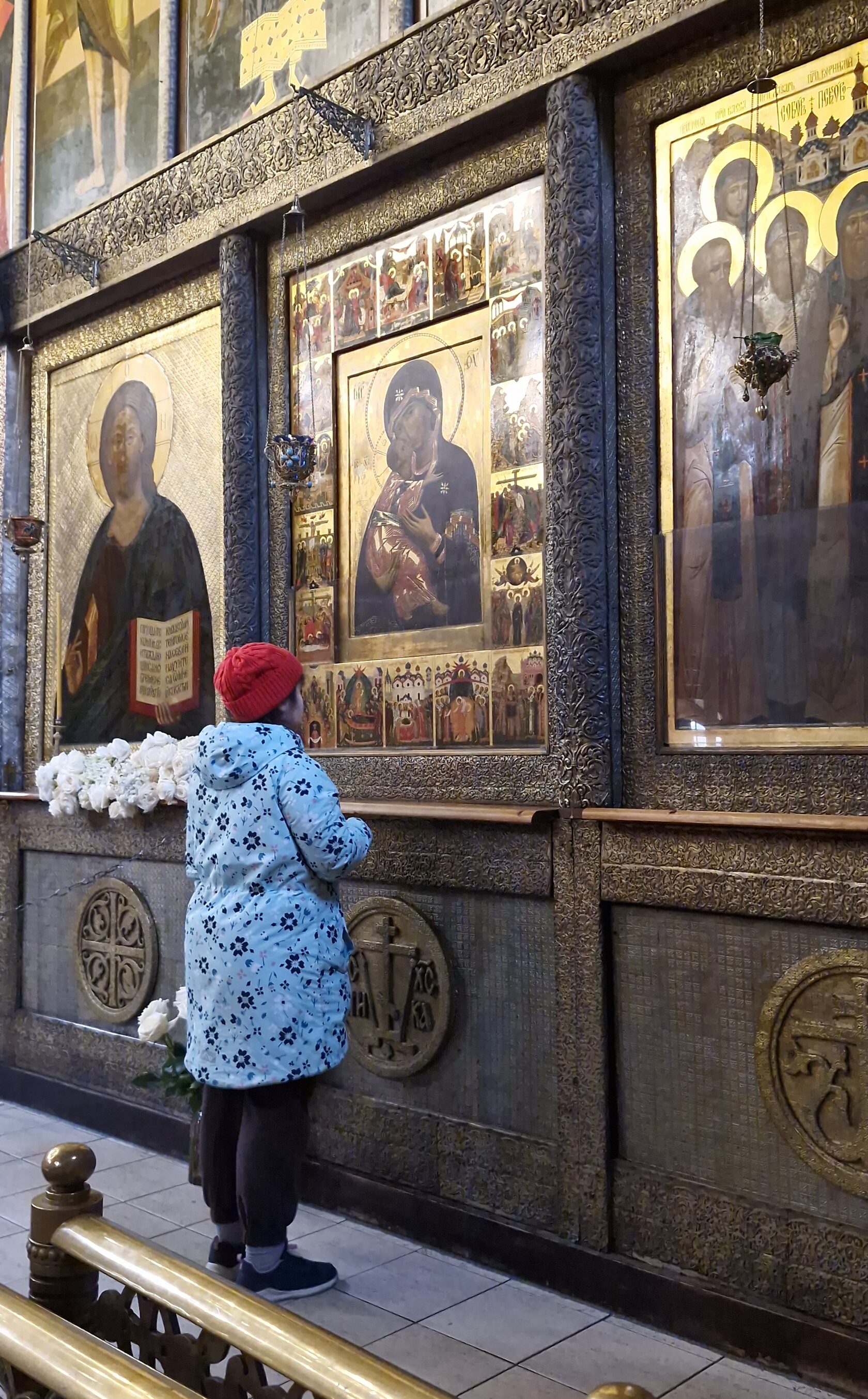 В новом соборе Воскресения Христова и Новомучеников и Исповедников Церкви Русской ребята сразу заметили в нескольких местах собора среди прочих святых свт. Тихона, патриарха Всероссийского, святого покровителя родного храма. Экскурсовод отметил, что во время своего патриаршества свт. Тихон несколько раз служил в монастыре и именно он назначил священномученика Илариона наместником Сретенского монастыря.