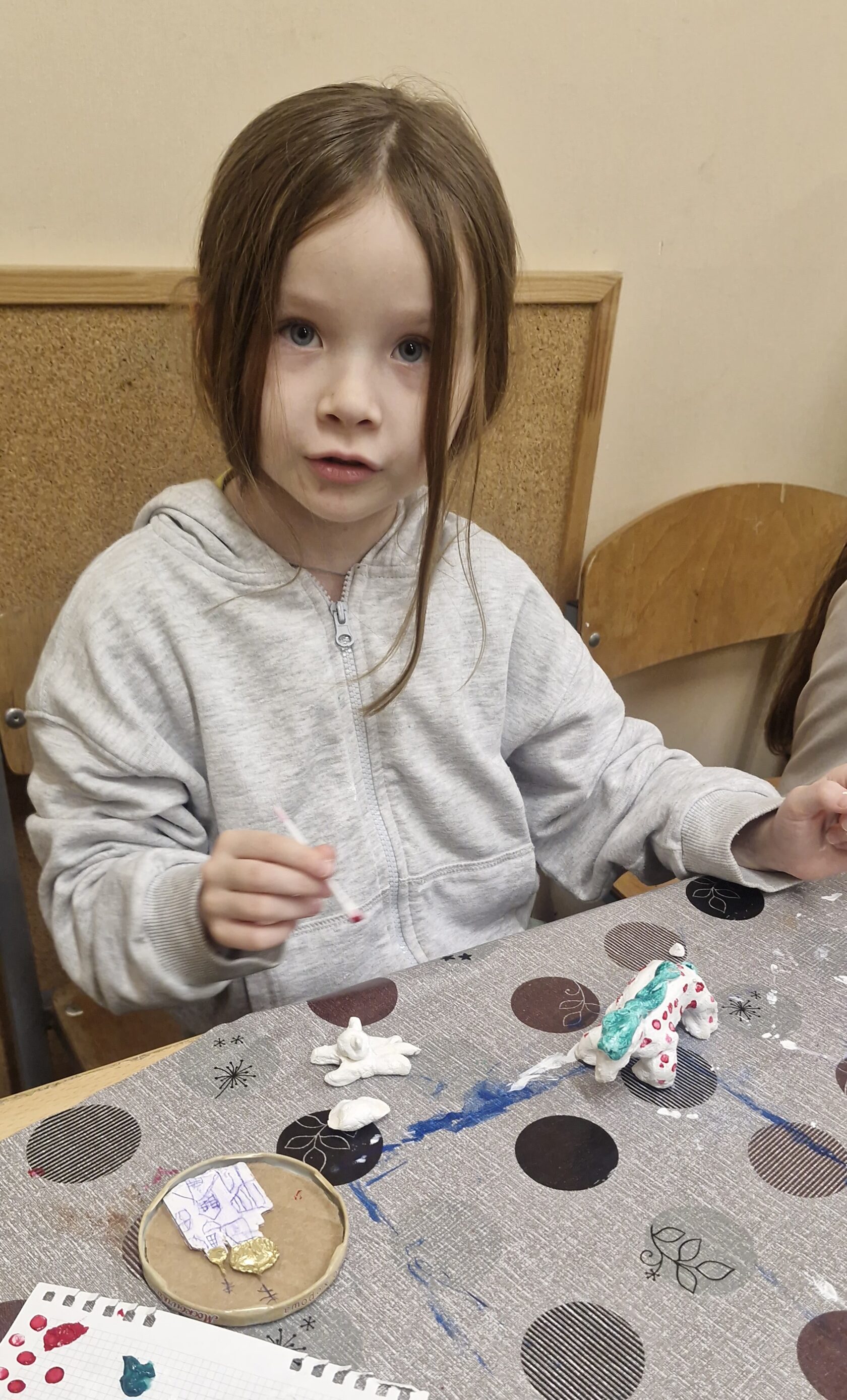 На следующий день, когда слепленные игрушки уже подсохли, Лена рассказала о сюжетных особенностях дымковского орнамента. Затем с помощью специальных красок ребята приступили к росписи своих лошадок.