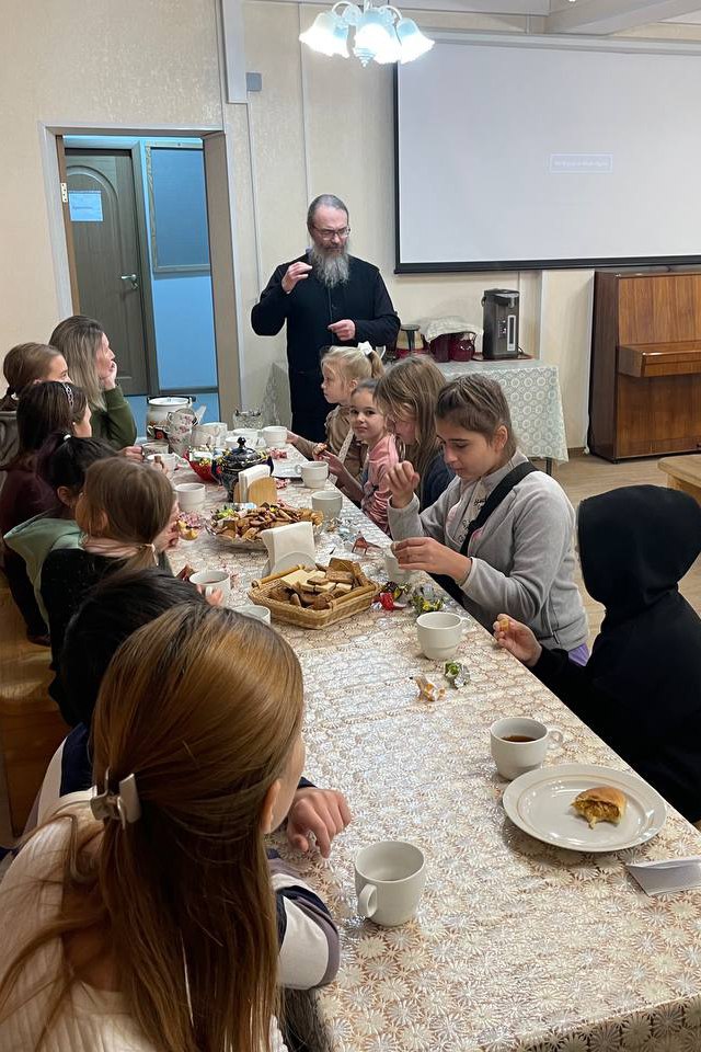 После экскурсии настоятель храма иерей Владимир Галкин пригласил гостей на чаепитие. За дружеской трапезой он ответил на интересующие вопросы и предложил продолжить тематические встречи в Знаменском храме.