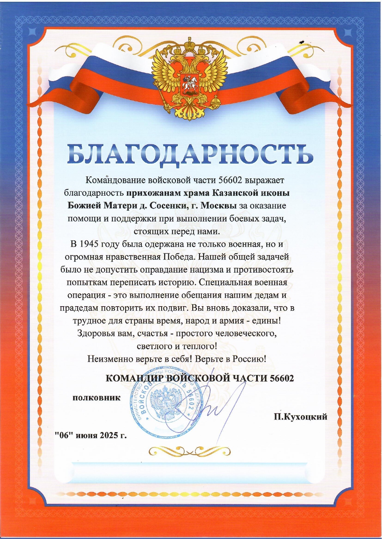 Благодарность от командования в/ч 56602 в адрес прихожан