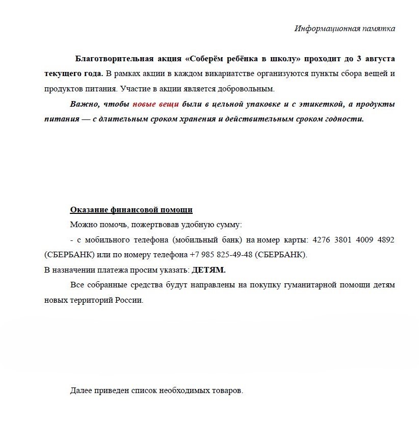 Перечень необходимых предметов и более детальная информация о сборе приведена в информационной памятке.